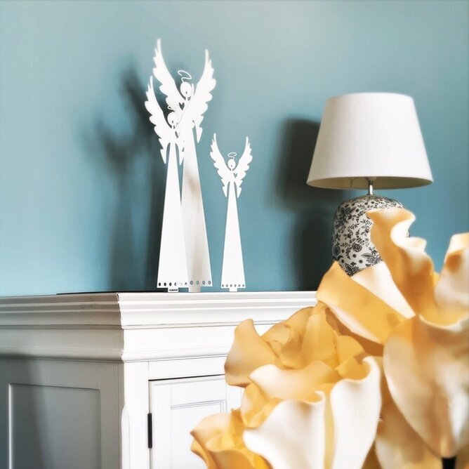 Inredningen runt änglarna bidrar till en hemtrevlig och inbjudande atmosfär. De står på en vit byrå som har subtila sniderier, vilket ger en känsla av tidlös design. En lampa med en mönstrad fot och vit skärm står intill figurerna. Lampans symmetri och lätta kurvatur harmoniserar med änglarnas linjer och förstärker rummets estetiska balans.