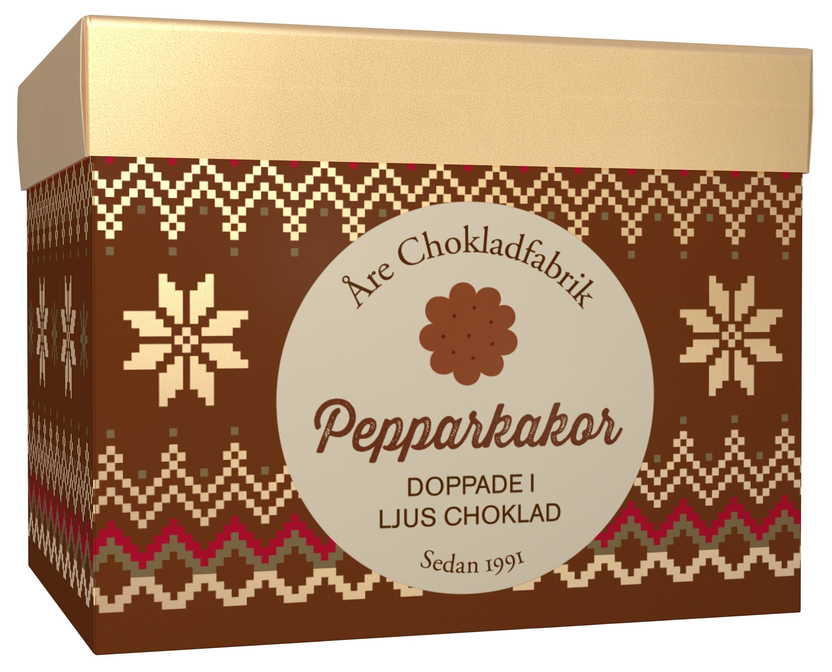 På framsidan av förpackningen finns en stor rund etikett i en något ljusare nyans än bakgrunden, vilken bär namnet Åre Chokladfabrik. I centrum av etiketten står produktnamnet "Pepparkakor" tydligt och centralt, följt av texten "doppade i ljus choklad". Texten är tryckt i en mjukt rundad och lättläst stil, vilket ger en personlig och inbjudande touch.