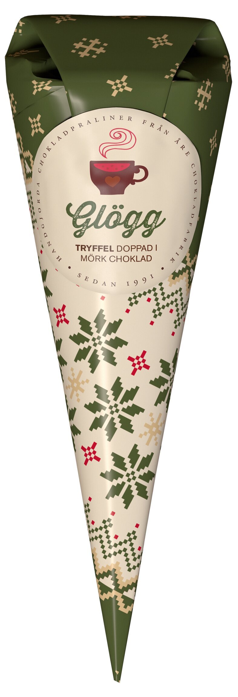 Toppen av struten är prydd med ett runt märke där produktens innehåll framgår: tryffel doppad i mörk choklad. Texten "Glögg" står med snirkliga bokstäver och antyder den smakrika upplevelsen som väntar inuti. Det centrala motivet, en ångande kopp, förstärker associationen till varma drycker och högtider.