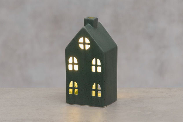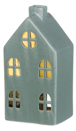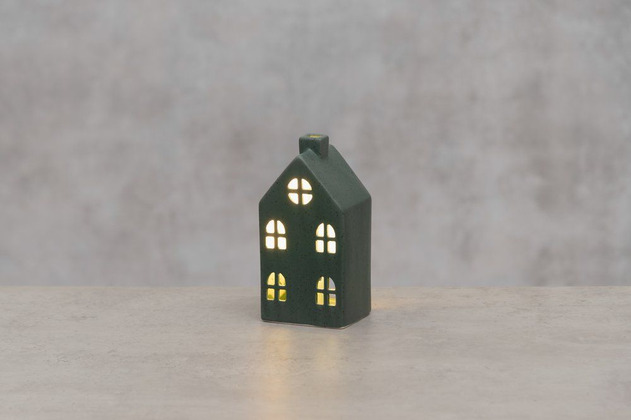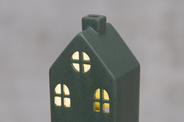 Ett stilrent litet hus i keramik som sprider ett mjukt och rogivande sken genom sina klassiska fönster. Den dova mörkgröna tonen och den enkla formen gör lyktan lätt att placera i både moderna och traditionella hem. Perfekt att kombinera med fler huslyktor för att bygga en stämningsfull liten ljusby.