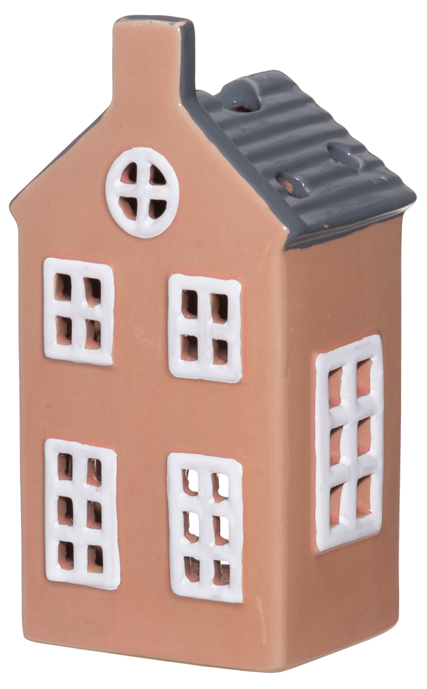 Ett stilrent hus i keramik med mjukt tegelrosa ton och kontrasterande grått tak. De vita fönstren lyser upp och ger ett varmt och inbjudande sken när LED-ljuset är tänt. Den klassiska formen gör att lyktan passar lika fint ensam som i en samling av flera huslyktor för att skapa en egen liten stad.