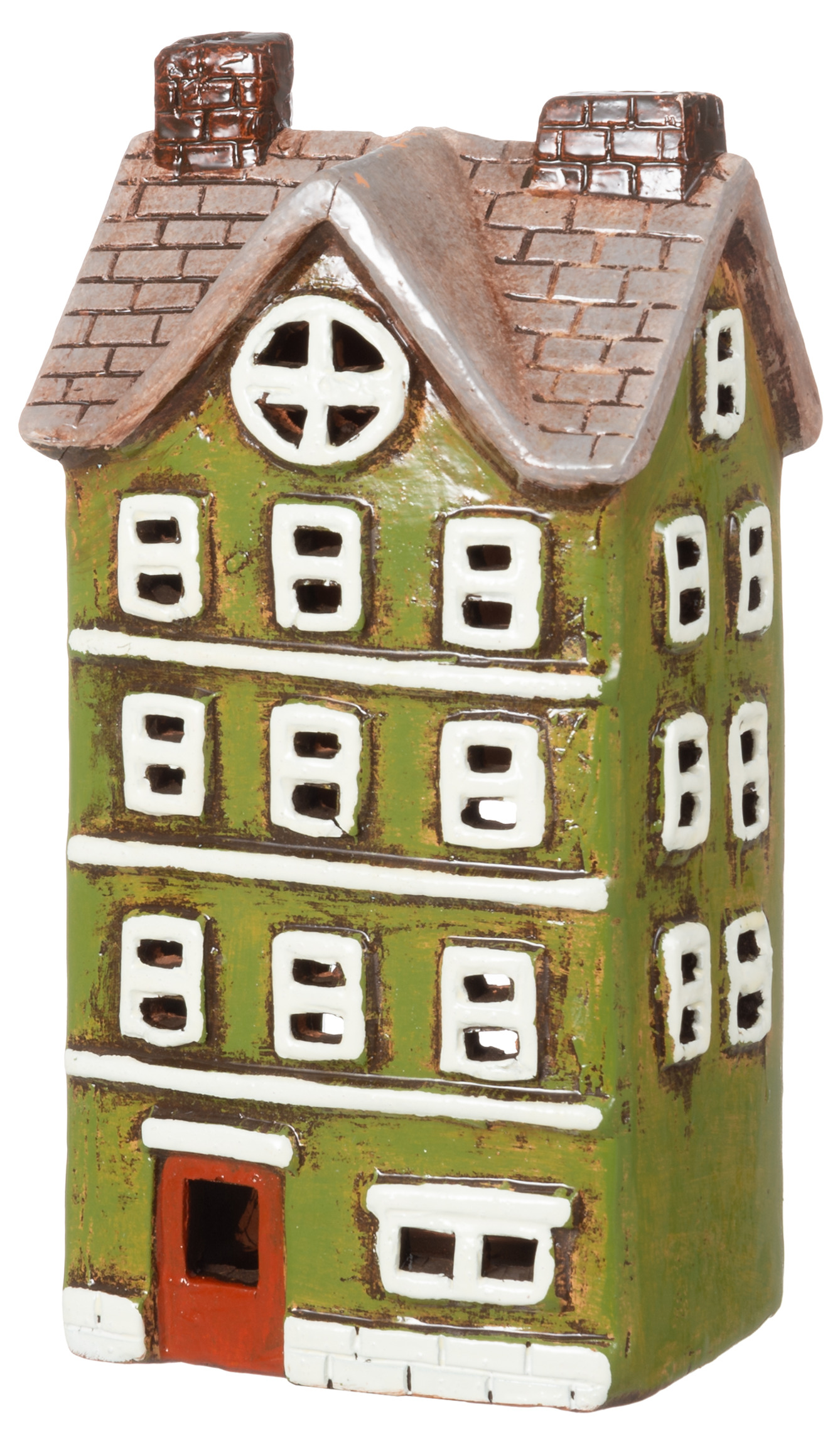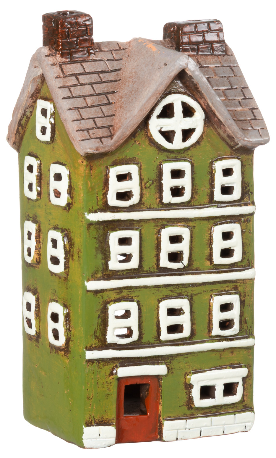 En karaktärsfull ljuslykta i form av ett högt hus med gröna väggar, brunt tak och många små fönster. När du tänder ett ljus sprider sig skenet vackert och lyser upp varje våning, vilket skapar en mysig och inbjudande känsla.