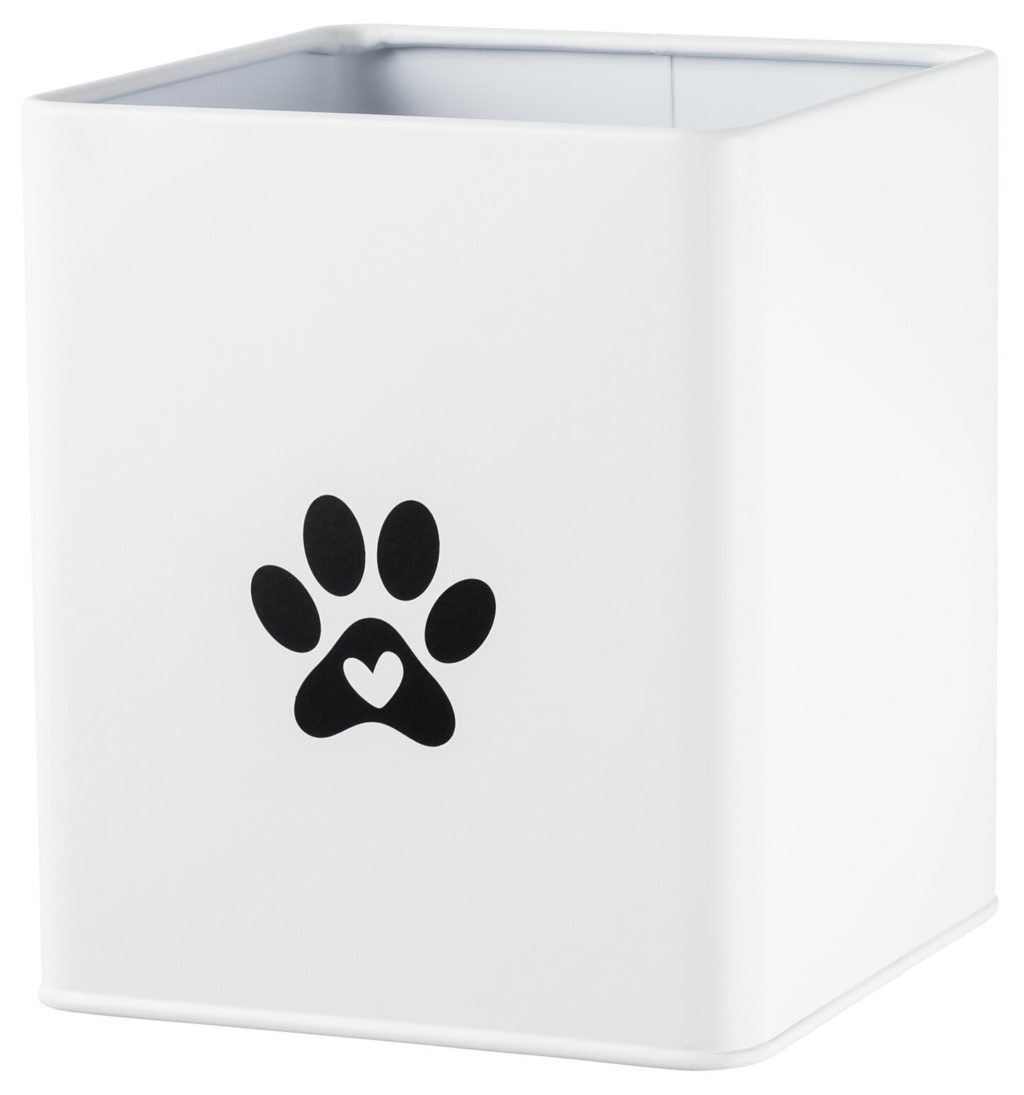 Denna praktiska förvaringsburk i metall rymmer upp till 3 liter och passar perfekt för torrfoder eller favoritsnacks till våra fyrbenta favoriter. Den vita designen med svart tassavtryck gör den både dekorativ och funktionell i köket. Locket håller innehållet fräscht och har ett charmigt handtag format som en tass – en liten detalj som gör stor skillnad.