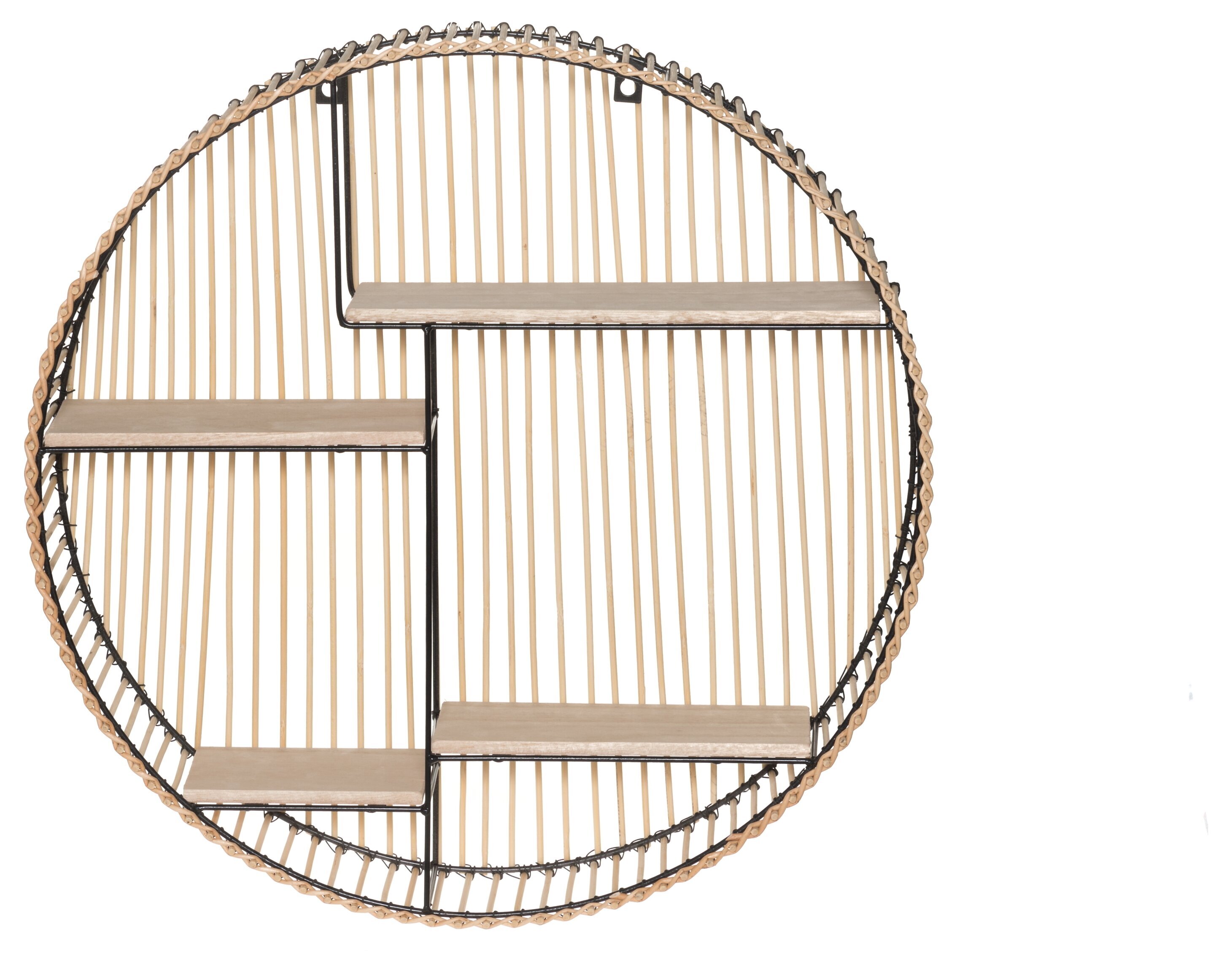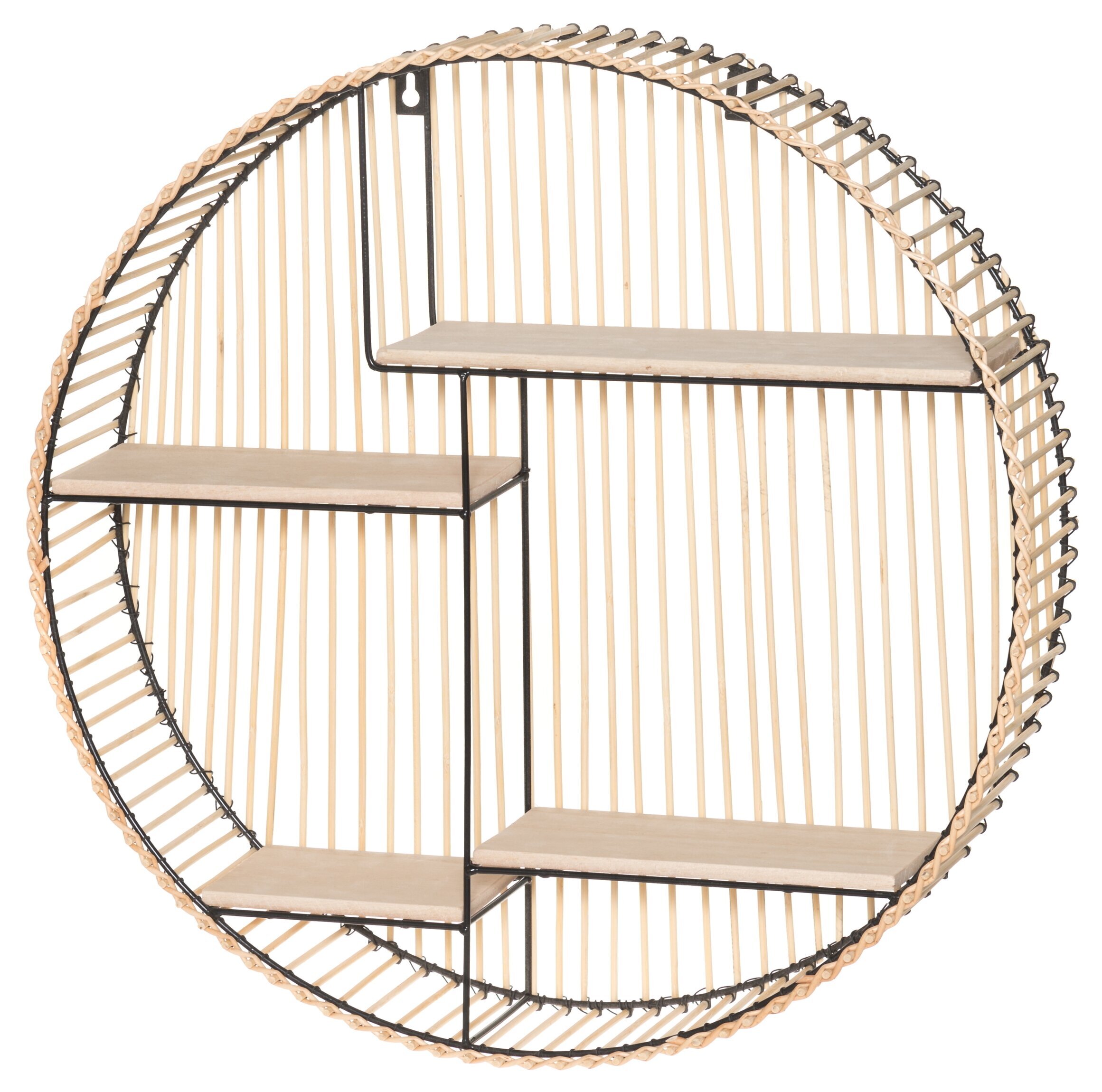 Rund vägghylla som ger ditt hem en naturlig och modern känsla. Med sin unika design i metall och flätad rotting blir den ett stilfullt inslag på väggen samtidigt som den erbjuder praktisk förvaring. De fyra hyllplanen är perfekt för att visa upp små dekorationsföremål, växter eller andra personliga detaljer. Hyllans diameter och luftiga konstruktion gör att den passar i både små och stora rum och den ger en varm jordnära känsla.