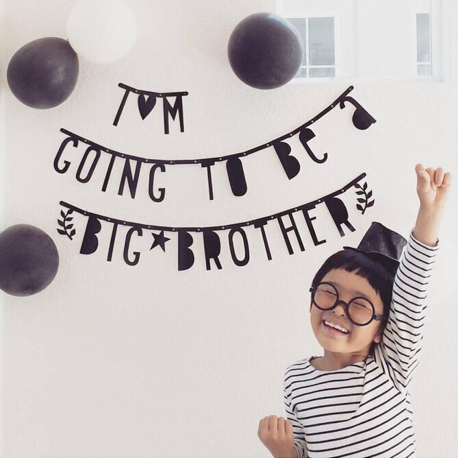 Bilden visar en livfull scen med en glad pojke som står framför en vägg dekorerad med en bokstavsgirlang från A Little Lovely Company. Girlangen visar texten "I'm going to be a big brother" i stora, svarta bokstäver. Texten är uppdelad på två rader och hålls samman av en tunn tråd som formar en båge mot väggen.