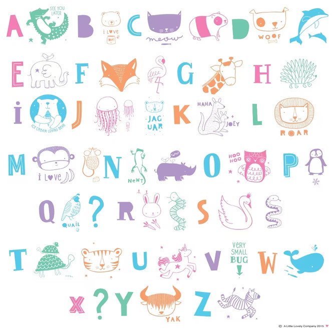 På bilden från Köpstaden.se presenteras det färgglada och lekfulla Letter Set ABC Pastell från varumärket A Little Lovely Company. Denna illustration fångar alfabetet med varje bokstav åtföljd av charmiga djur och figurer som kombinerar både pedagogik och underhållning.