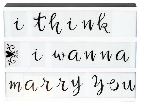 Överst på ljuslådan står orden "i think", placerade så att de ger en luftig och välbalanserad känsla. Mittenraden bär på orden "i wanna", vilket förstärker det uttrycksfulla budskapet. Slutligen avslutas texten med "marry you", tydligt och i samma harmoniska stil som de föregående raderna.