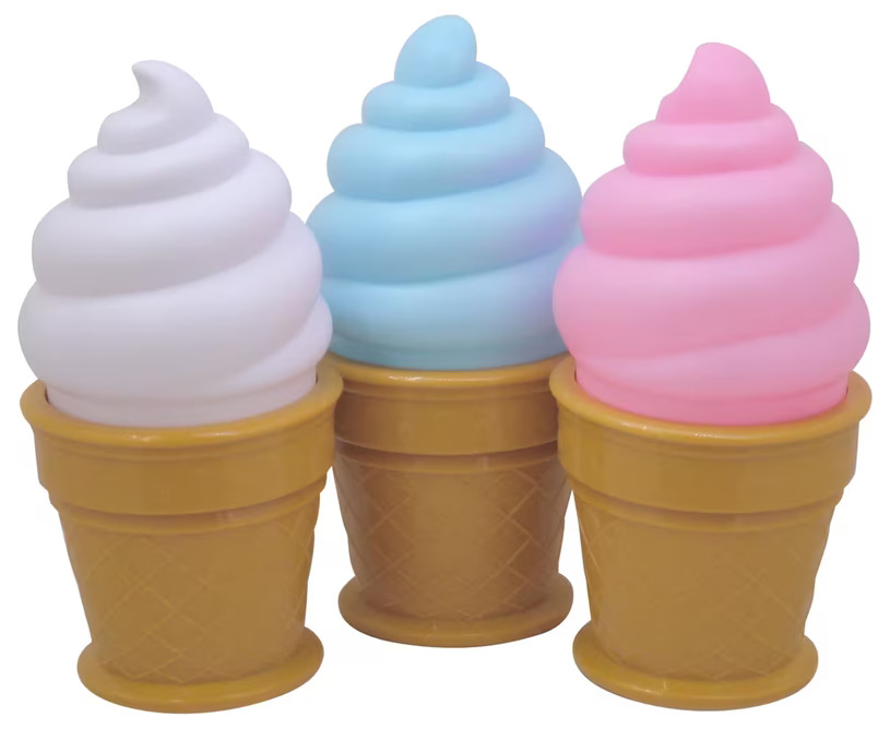 Söt nattlampa med utseende utav en smarrig vaniljglass. Lampan tänds och släcks genom att trycka på toppen av glassen. Batterier medföljer ej (3 x 1,5V AA). Finns i 3 olika färger.