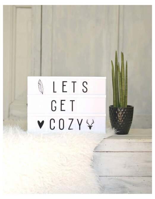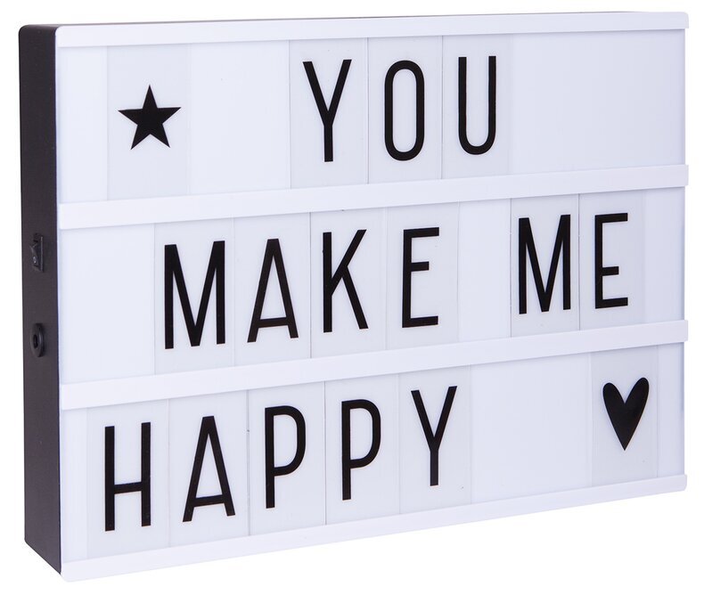 Snygg ljusbox A4 med plats för text samt symboler på 3 rader. Skriv härliga citat, kärleksförklaringar, ordspråk bara fantasin sätter gränser. Ändra texterna hur ofta du vill, bokstäverna är återanvändbara. Ljusboxen ger ett behagligt ljus och blir en riktigt mysig inredningsdetalj. Medföljer 85 stycken tecken som är tillverkade i kraftig och tålig plastfilm. .