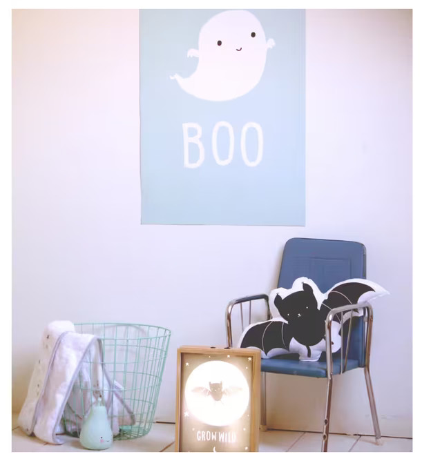 Bilden visar ett inbjudande och stilrent rum där produkter från Köpstaden.se, en mångsidig butik som erbjuder produkter för vardagens behov, finns med. Ett centralt element är en poster från varumärket A Little Lovely Company, som smyckar väggen med sitt lekfulla motiv. Postern föreställer ett glatt, vitt spöke med texten "BOO" på en ljusblå bakgrund, vilket skapar en lättsam och barnvänlig atmosfär.