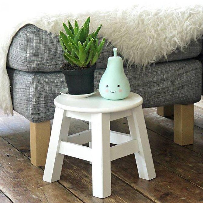 På bilden ser vi ett hemtrevligt arrangemang i ett modernt vardagsrum. Framför en luftig grå soffa med träben står en liten, vit rund pall av trä. På pallen vilar två stilrena dekorationer: en grön suckulentplanta i en svart kruka, samt produkten Mini Pear Light från varumärket A Little Lovely Company. Denna söta ljuskälla har formen av ett päron och har en mjuk, mintgrön nyans. Den utstrålar en behaglig och mysig känsla med sitt lilla leende och sina runda kinder, vilket gör den till en perfekt accessoar i ett barnrum eller som ett charmigt inslag i heminredningen.