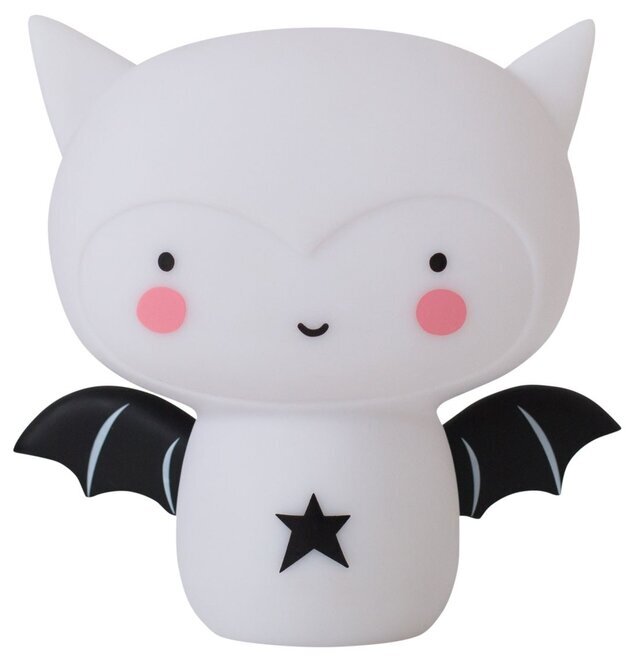 Bilden från Köpstaden.se av nattlampan från A Little Lovely Company visar en söt och fantasifull design av en fladdermus som fungerar som en upplyst nattkompis. Den har en härligt rund form med ett uttrycksfullt ansikte som ger en känsla av vänlighet och trygghet. Fladdermusens kropp är mjukt kurvad, med stora, stiliserade ögon och en liten uppåtvänd mun. Kinderna är dekorerade med två runda, rosiga fläckar som bidrar till det lekfulla uttrycket.