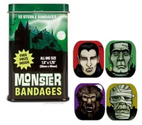 Bilden visar ett färgglatt och fantasifullt plåsterpaket från Köpstaden.se. Förpackningen är märkt med namnet Monster, med produkter från varumärket Accoutrements, och innehåller en rad unika plåster med monster-tema. På framsidan av det stående paketet syns ett skrämmande slott i silhuett mot en mystiskt grön bakgrund, vilket skapar en känsla av halloween och mörka nätter. Texten "12 sterile bandages" betonar innehållets praktiska användning och hygien.