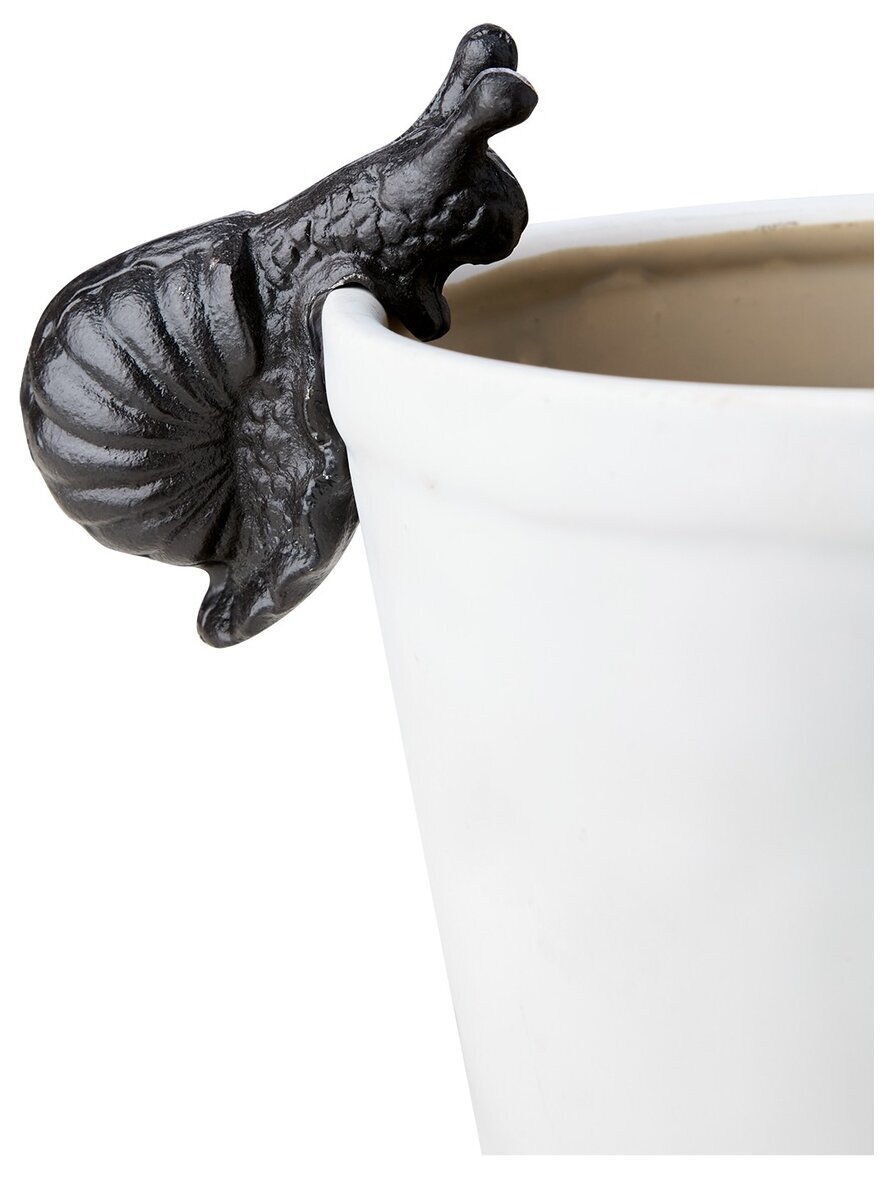 En dekorativ krukdekoration i form av en liten snigel som vilar över krukans kant. Den mörka metallfinishen skapar en fin kontrast mot ljusa krukor och ger en charmig, lite lekfull känsla till dina växter.
