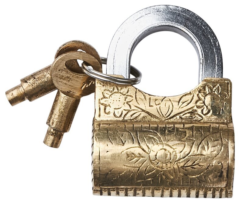 Detta specifika hänglås är tillverkat i mässing, vilket ger det en distinkt och solid känsla. Mässingsytan har en naturlig gyllene ton, som skapar en varm och inbjudande estetik. Det finns en dekorativ gravyr på framsidan av låset som ger hänglåset en unik och konstnärlig touch. Dessa detaljer består av intrikata blommönster och bladverk, vilket ger en extra dimension till låsets annars funktionella design.