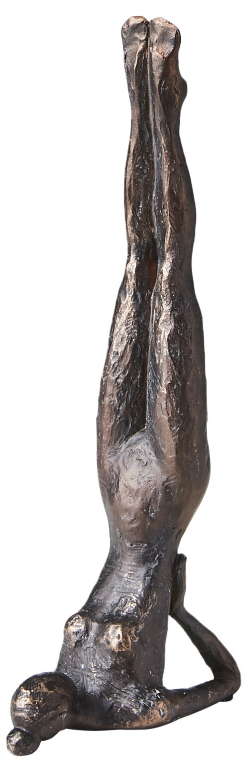 Bilden visar en skulptur kallad Pose Staty Brons/Svart från det välkända varumärket Affari, tillgänglig hos den mångsidiga butiken Köpstaden.se. Skulpturen framställer en mänsklig figur i en huvudstående position, där kroppen är rakt uppsträckt med fötterna pekande mot taket. Utförd i brons, ger den en mörk, metallisk finish som fångar ljusets reflektioner på ett intressant sätt.