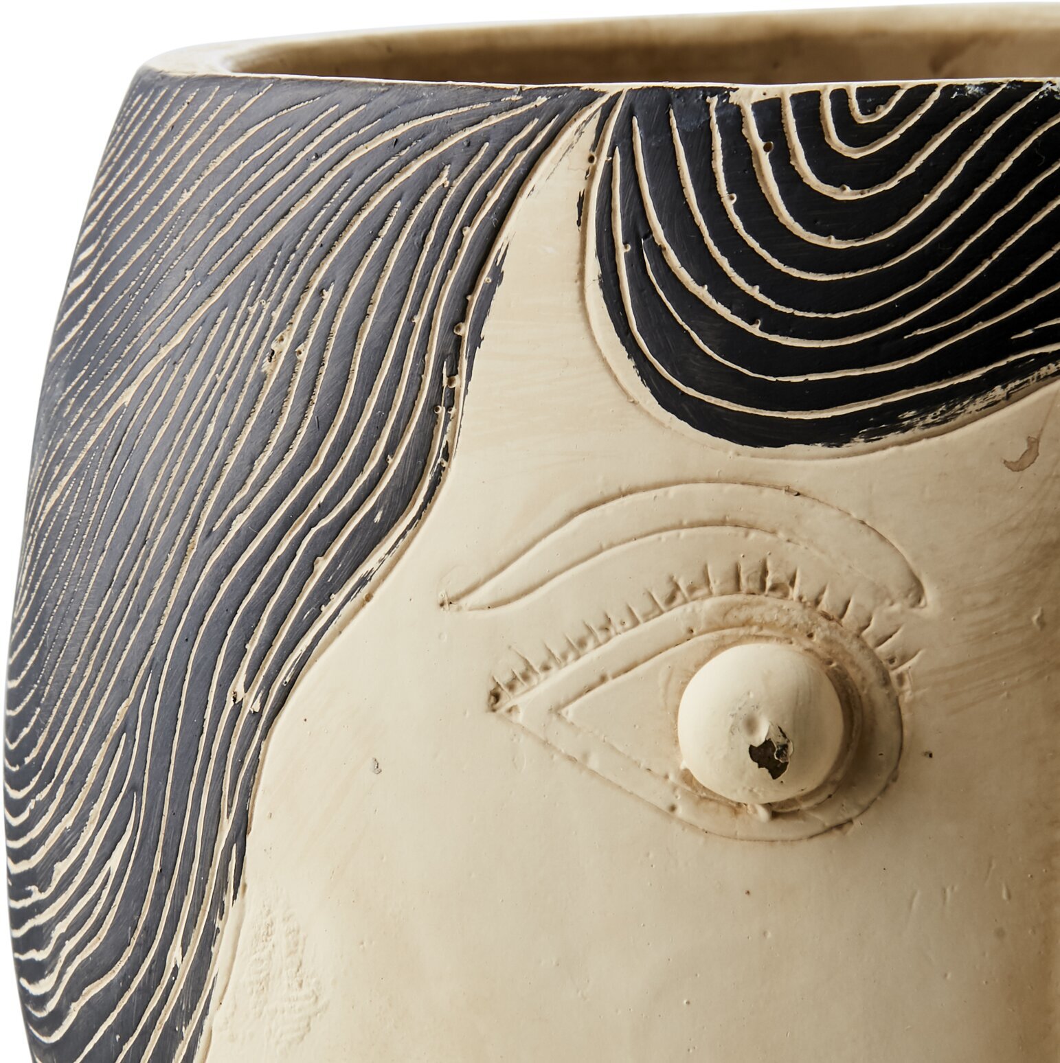 Bilden visar en närbild av krukan Camille L i färgerna beige och svart, som finns i Köpstaden.se:s sortiment. Denna specifika produkt från varumärket Affari bjuder på en intressant och detaljerad design. Krukan glänser i en subtil mix av beige och svart, vilket är en utmärkande kombination som ger karaktär till dess yta. Denna keramiska kruka har ett skulpterat motiv som pryder dess sidor, där ett ansikte utgör det centrala elementet.