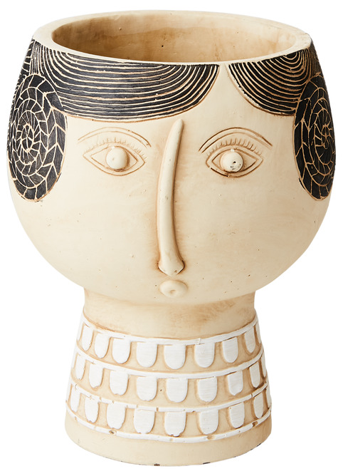 Det detaljerade mönstret i håret är ett tydligt inslag, med svarta linjer som buktar och vrider sig runt huvudet. Dessa linjer skapar en känsla av rörelse och liv i designen, vilket gör krukan till ett både funktionellt och dekorativt objekt. Den nedre delen av krukan följer samma känsla av detaljer, med ett mönster som påminner om ett rustikt halsband eller dekorativa ränder, vilket förstärker dess unika form och stil.
