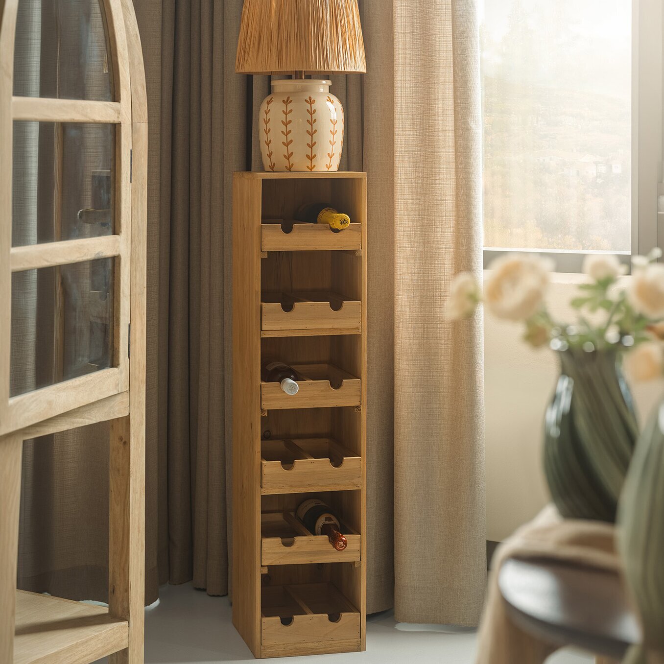 Det här stilrena vinstället i trä är en både praktisk och snygg lösning för dig som vill förvara dina vinflaskor på ett ordnat sätt – utan att kompromissa med känslan i rummet.