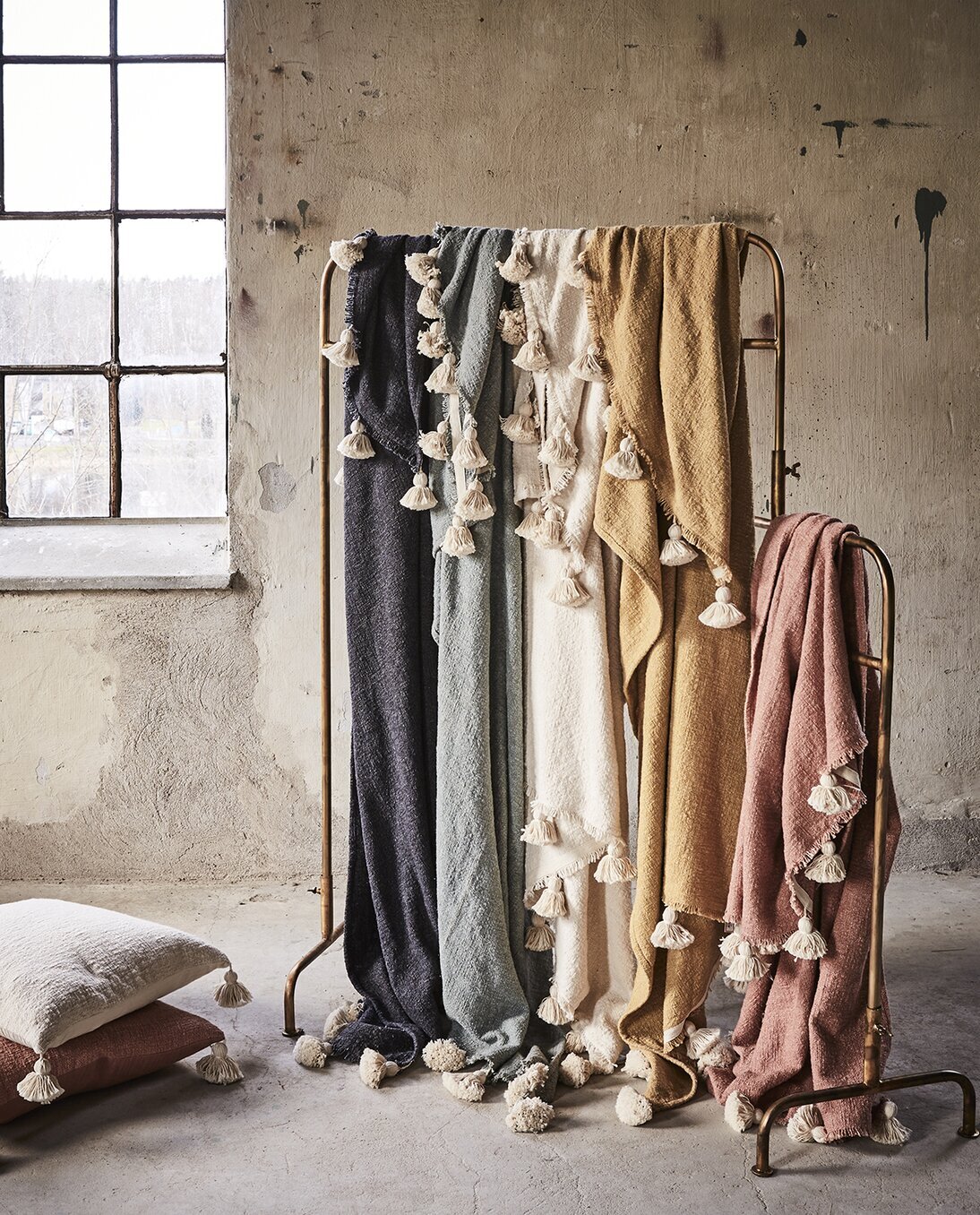Till vänster om ställningen finns kuddar i liknande toner, som ligger staplade på varandra. Dessa kuddar är även dekorerade med tofsdetaljer som speglar plädarnas design och förstärker den sammanhållna estetiken i bilden. Textiliernas grova men samtidigt mjuka yta ger en känsla av komfort och värme.