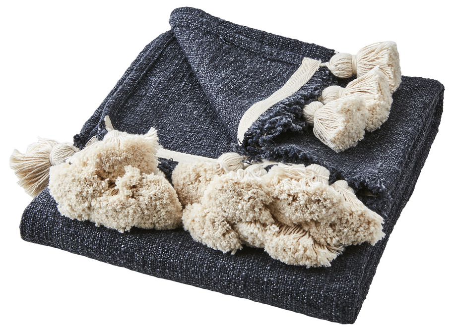 Pläd i en vacker midnattsblå nyans med naturfärgade tofsar, från Affari.