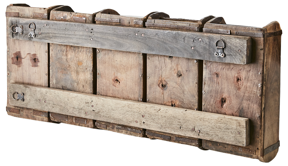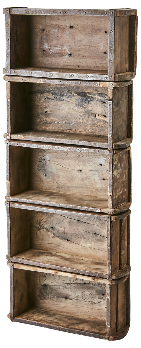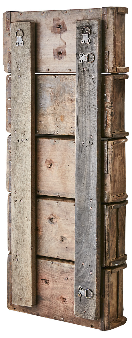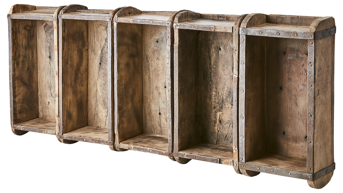 Dekorativ vägghylla med ihopsatta murstensformar, alla hyllor är unika så ingen är den andre lik. Varje murstensform bär på sin egen historia med rostningar, metallbeslag & slitningar.
