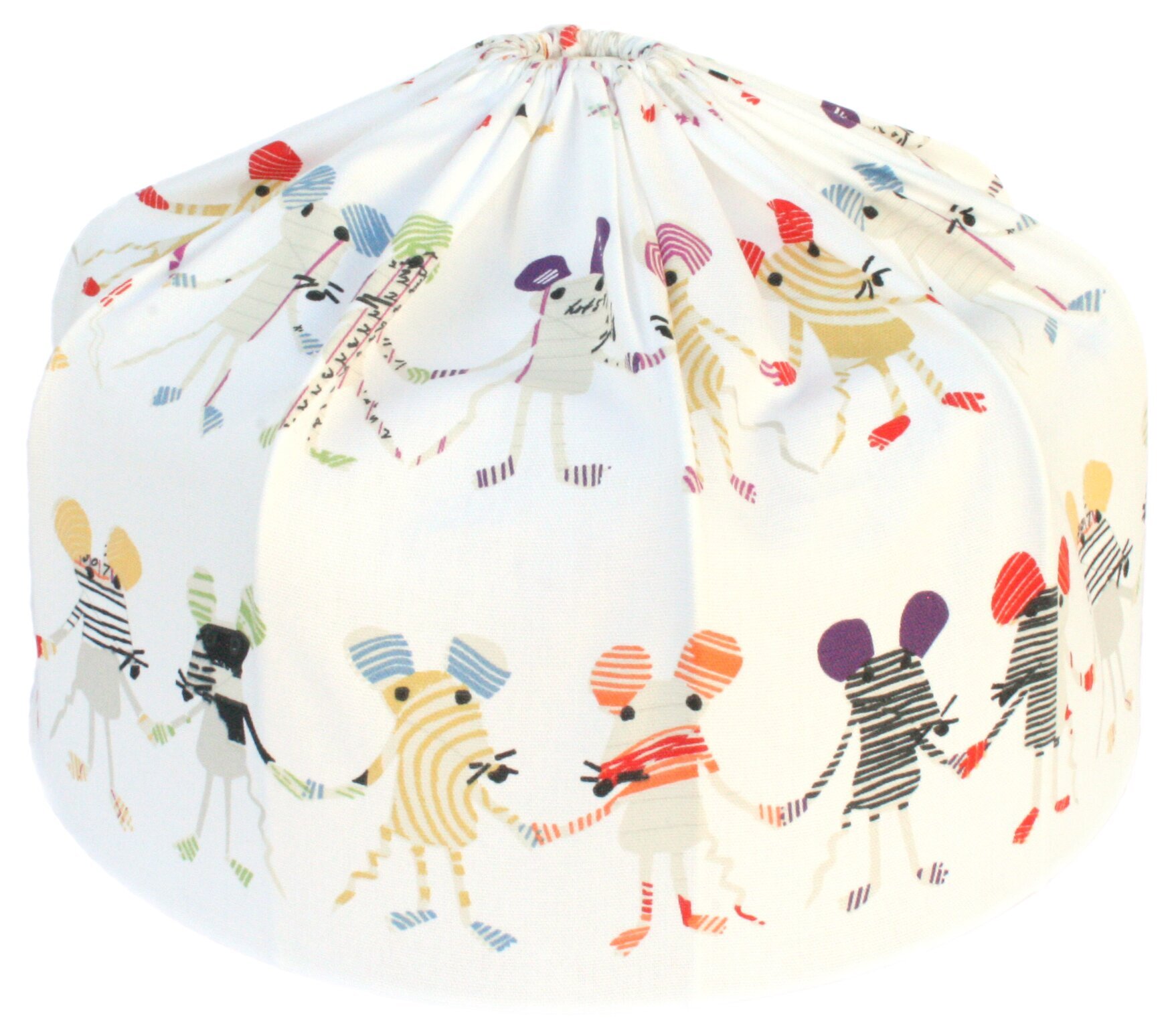 Bilden föreställer en lampskärm från varumärket Alina design4hem, tillgänglig på Köpstaden.se. Lampskärmen Mia Möss barn är prydd med ett lekfullt motiv som väcker glädje och fantasi hos de yngre. Det vita tyget utgör en neutral bas, vilket gör det möjligt för de färgglada mössen att stå ut med sina olika starka färger.