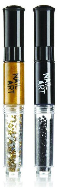 Den vänstra tuben är delvis fylld med små, glittrande partiklar i guldtoner. Den övre delen av denna tub är av en djup svart färg, med en text som säger "Nail Art" i en vit, elegant stil. Det svarta locket har ett modernt utseende och ger en professionell känsla till produkten. Under denna svarta sektion syns ett rör fyllt med guldskimrande dekorationer, perfekt för att skapa unika och iögonfallande nageldesigner.