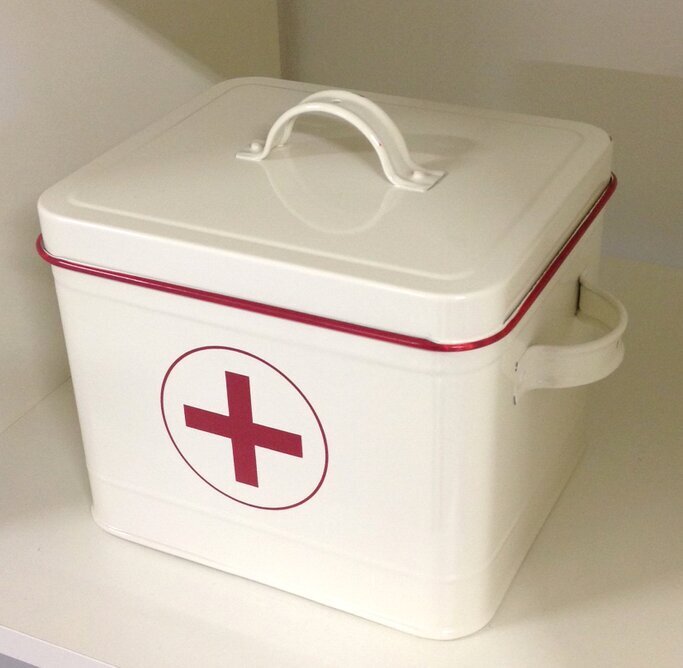Locket pryds av ett robust handtag, också tillverkat av plåt, vilket gör lådan enkel att bära och hantera. Runt kanten av locket löper en röd rand vilket ger en stark kontrast till den annars vita ytan. Detta kontrastfyllda mönster är inte bara dekorativt men också funktionellt, eftersom det underlättar identifiering av medicinlådan bland andra förvaringslösningar.