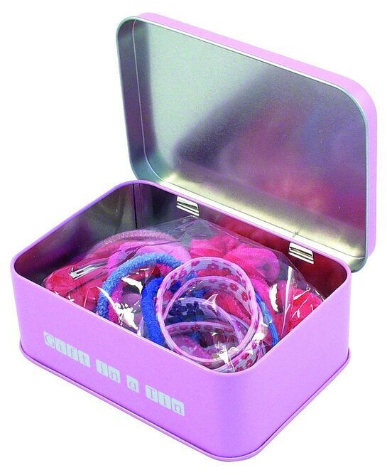 I denna plåtburk kan du förvara de medföljande hårsnoddarna & hårspännena. En fin ge bort present till den lilla prinsessan eller till någon som är i behov av håraccessoarer.