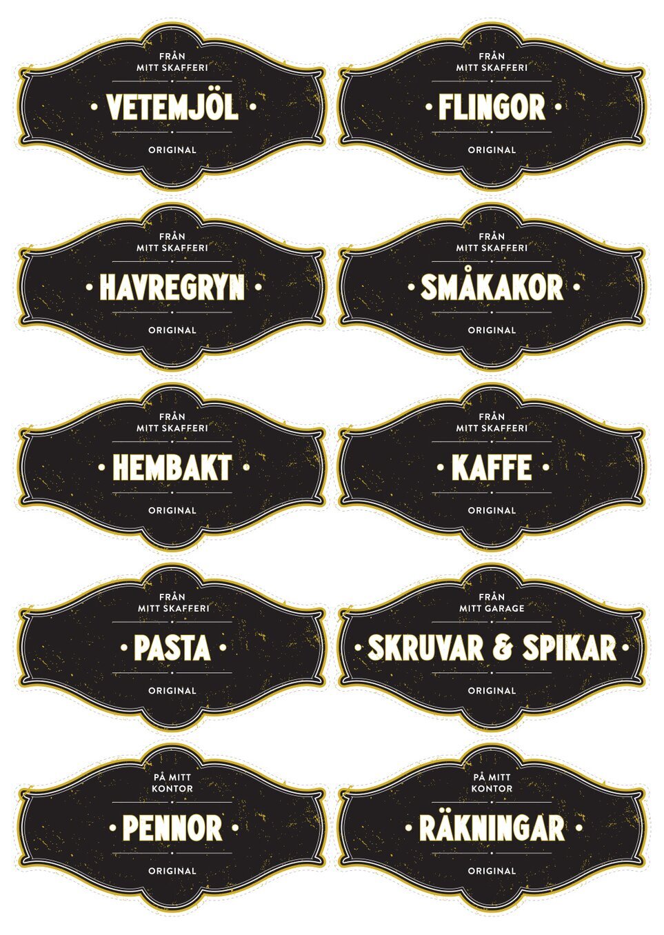 Övriga etiketter bär olika benämningar såsom "Vetemjöl", "Havregryn" och "Pasta", vilket ger användaren möjligheter att strukturera och kategorisera på ett sätt som tilltalar det moderna hemmet likväl som det traditionella. Varje etikett är märkt med uttrycket "Från mitt skafferi" eller andra liknande fraser, vilket understryker deras syfte och användningsområde. Den text som omger mitten skapar en känsla av hemtrevnad och förankring.