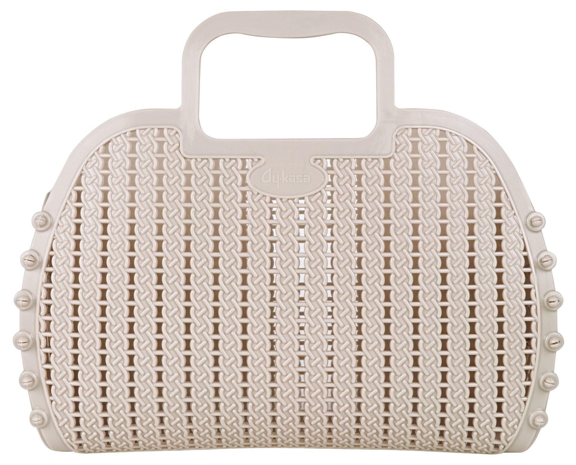 Mini bagen är tillverkad av ett hållbart material, vilket ger den en robust känsla samtidigt som den är lätt att bära med sig. På bilden ser vi en struktur med ett flätat mönster i plast, vilket ger väskan en luftig och lätt karaktär utan att kompromissa på styrkan. Dess grå ton är neutral och matchar enkelt med en mängd olika stilar och användningsområden.