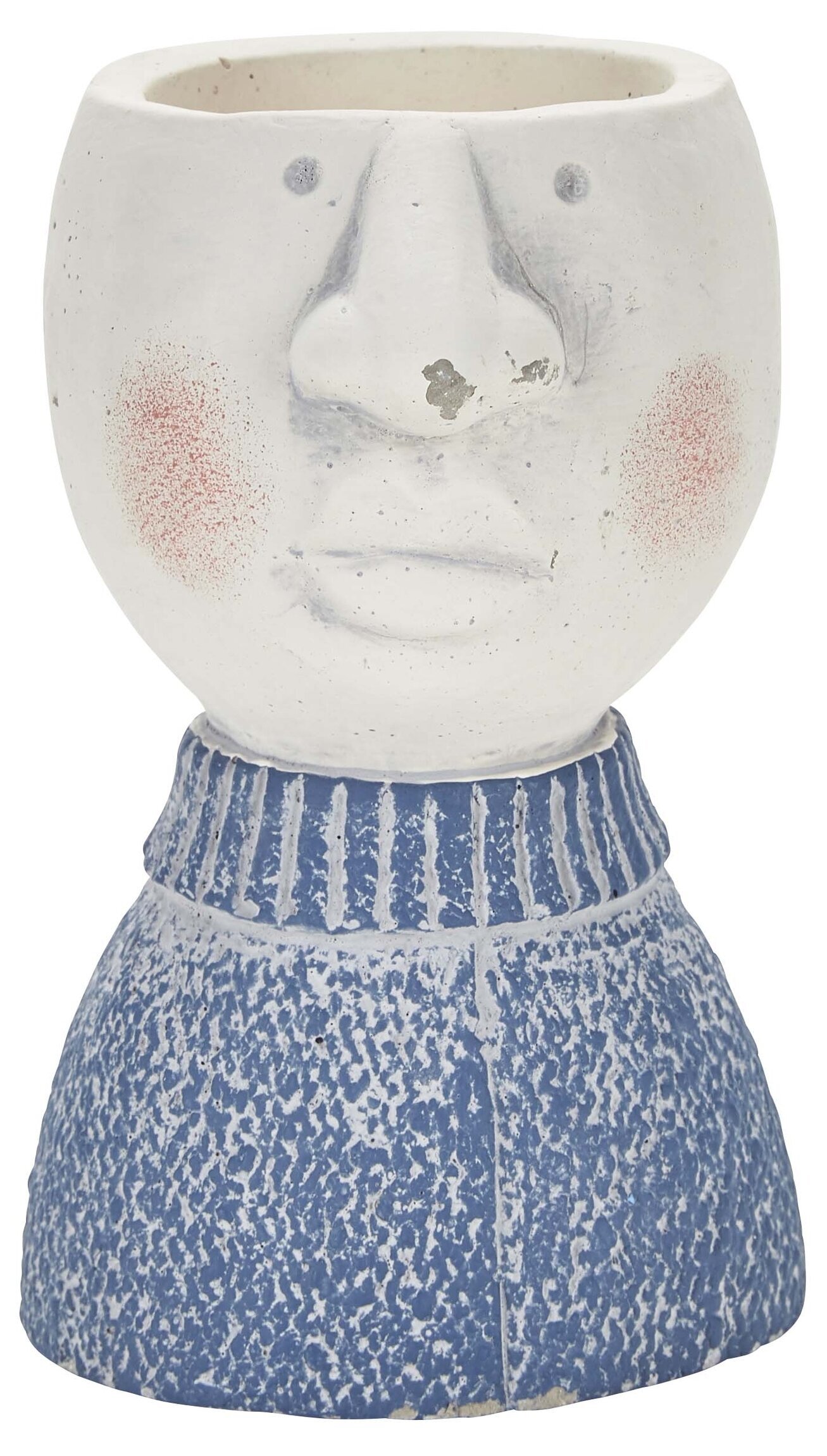 Krukan har en mjuk, vit ton som utgör basfärgen och bidrar till ett stilrent intryck. Den har subtila, rosiga kinder på vardera sida av det förenklade ansiktet, vilket ger en livfull och vänlig känsla. Ansiktet är minimalistiskt men detaljerat: två små prickar symboliserar ögon, medan näsan har en framträdande form mitt på krukan.