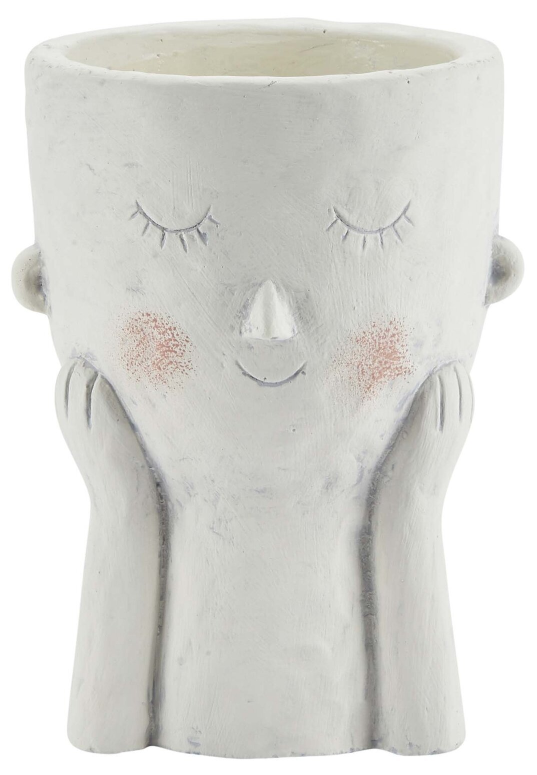 Denna dekorativa blomkruka har formen av ett ansikte med en mjukt vit nyans. Krukan ger intryck av ett handgjort hantverk, med subtila detaljer som skapar ett distinkt utseende. Huvudformen är rundad och underlagets textur är lätt skrovlig vilket förstärker hantverkskänslan.
