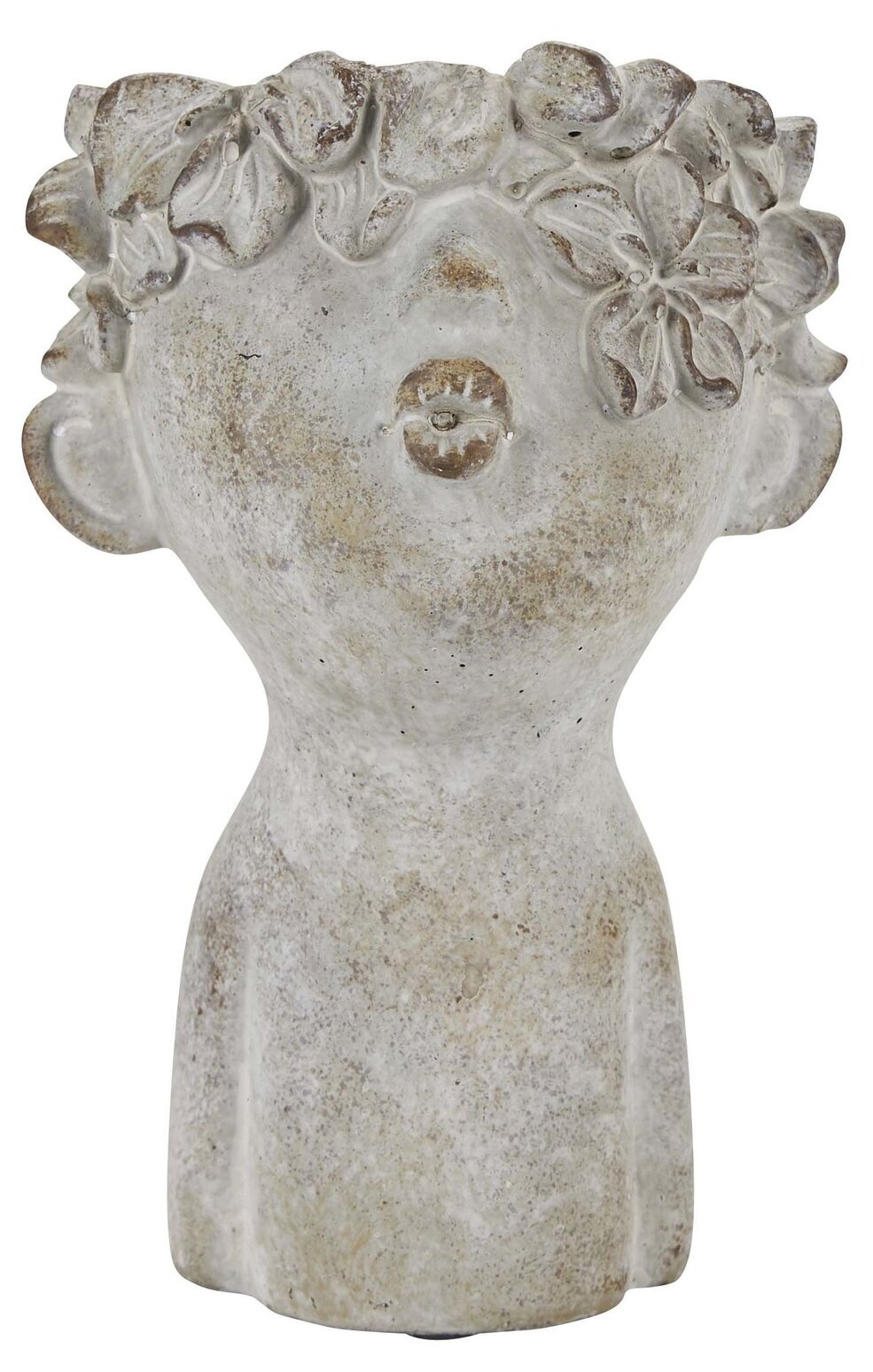 Överst på krukan pryds huvudet av en utsmyckning bestående av blommor som ser ut att bilda ett slags blomsterkrans. Blommorna är noggrant detaljerade med individuellt utformade kronblad och knoppar, vilket ger ett intryck av naturinspiration och kreativitet. Denna dekorativa delon lockar blicken och kompletterar den annars minimalistiska designen av själva ansiktet.
