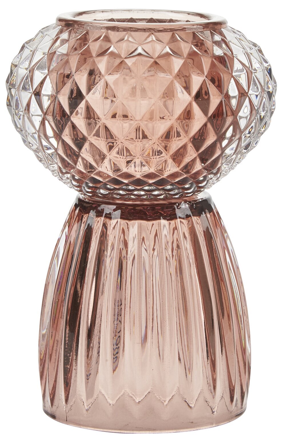 Den övre delen av ljushållaren är en skålformad konstruktion med en distinkt diamantliknande mönstring. De geometriska formerna är välbalanserade och ger en tredimensionell effekt, vilket gör att ljus och skuggor dansar över ytan när ett ljus placeras inuti. Färgen är en subtil nyans av rosa som förmedlar en känsla av värme och mjukhet, vilket gör den till ett välkomnande inslag i vilket rum som helst.