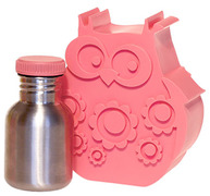 Bredvid flaskan finns en uggleformad matlåda, vilket bjuder in till en känsla av lekfullhet och funktionalitet. Matlådan har en klar rosa färg och ugglans detaljer är utmejslade på ett vis som ger både struktur och personlighet till produkten. Blafre, det innovativa varumärket bakom dessa kreativa mönster, är känt för sina unika och användarvänliga designlösningar.