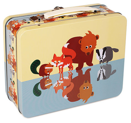 På de kortare sidorna av matlådan fortsätter temat med fler djur och naturmotiv, vilket gör designen helgjuten och konsekvent runt om. Locket hålls stängt med ett enkelt men robust spänne, och det finns ett bärhandtag i ljus nyans upptill för enkel transport.
