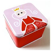 Bildens motiv är en fyrkantig, kompakt box i en livfull röd färg. Boxen, som erbjuds av Köpstaden.se, har ett lock dekorerat med en stiliserad teckning av en prinsessa, som ingår i sortimentet från varumärket Blafre. Prinsessans klänning och bakgrunden är i en rosanyans, vilket skapar en fin kontrast till boxens djupa röda sidor.