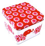 Bilden visar en liten box från märket Blafre, en söt och praktisk förvaringslösning som finns hos Köpstaden.se. Boxen är fyrkantig med jämna, släta kanter och kommer i en levande färgsättning som omedelbart fångar ögat. Locket, som är avtagbart, pryds av ett mönster med röda elefanter omgivna av vita och rosa blomcirklar. Dessa cirklar skapar en harmonisk kontrast mot den intensiva röda bakgrunden och ger en lekfull känsla.