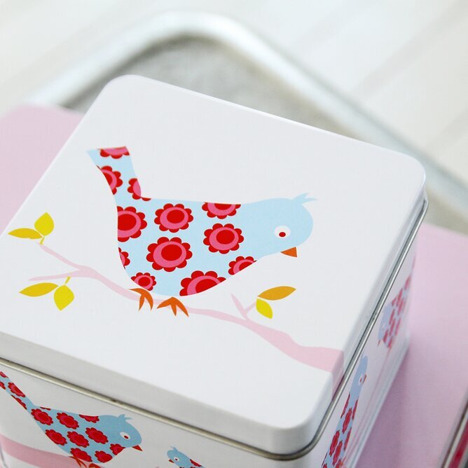 Bilden är tagen med fokus på locket, vilket ger en tydlig och detaljrik vy av fågelmotivet. Boxen står på ett underlag som ser ut att vara ljusrosa, vilket harmoniserar med färgerna i motivet och förstärker känslan av mjukhet och värme i bilden. En mindre del av vad som kan vara en bricka eller bord i bakgrunden är synlig med en suddigare skärpa, vilket bidrar till att betona själva boxen och dess detaljer ytterligare.