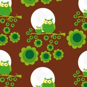 Ugglorna sitter på grenar, och var och en har en ljusgrön kropp med ett något mörkare huvud. Ögonen är stora och uttrycksfulla, med klara vita och gula detaljer som ger mönstret liv. Mellan ugglorna finns det också ett tilltalande inslag av blomliknande former i olika gröna nyanser. Dessa former är placerade asymmetriskt över ytan, vilket ger ett dynamiskt och lekfullt uttryck.