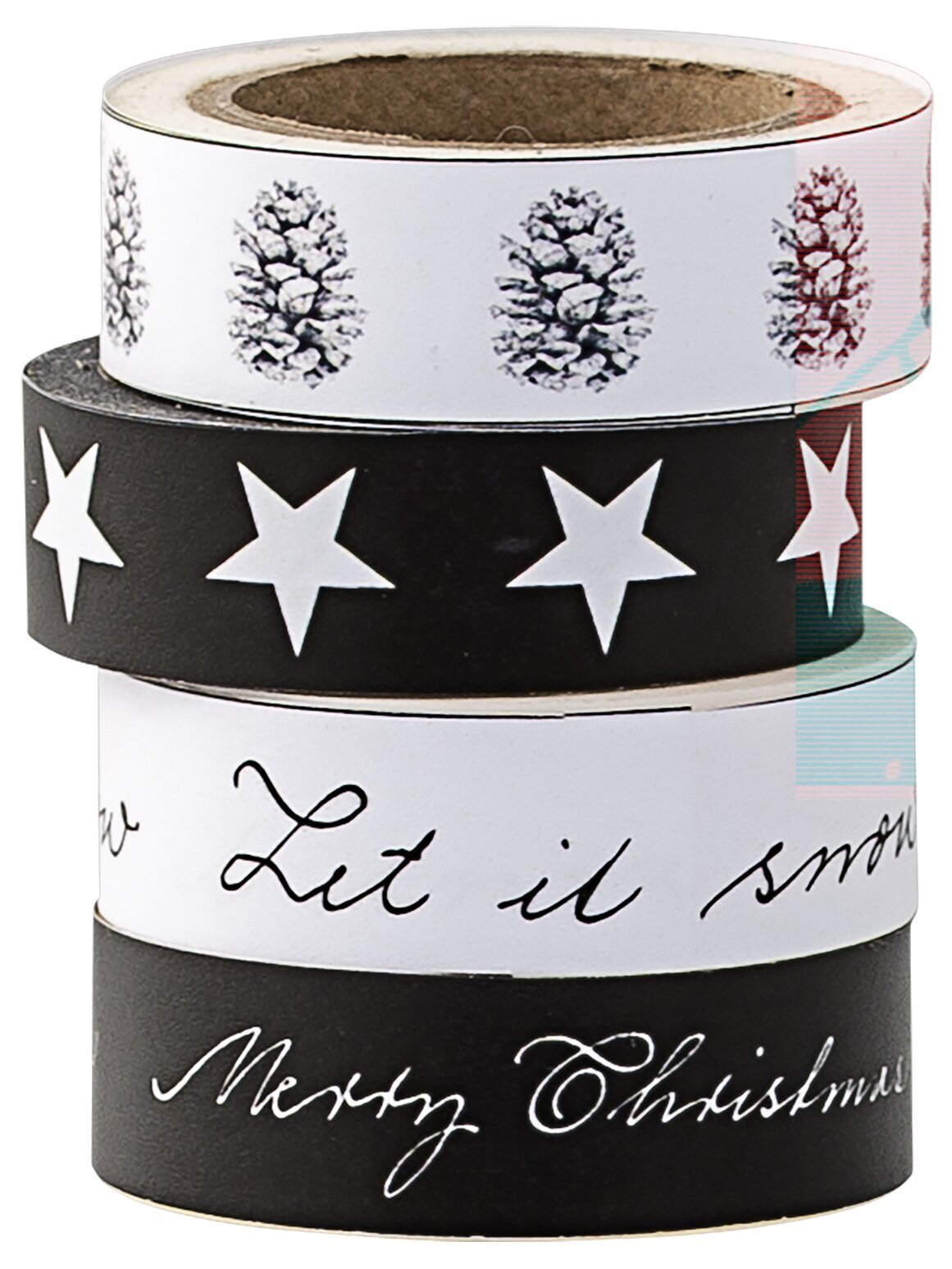 Bilden föreställer produkter från varumärket Bloomingville, tillgängliga på Köpstaden.se. Produkterna i fokus är fyra rullar av dekorativ tejp med jultema, under namnet Tejp Christmas. Dessa rullar är staplade på varandra och varje rulle har sitt eget unika mönster och design. Materialet ser ut att vara av papper med en lättarbetad struktur som är typisk för dekortejp.