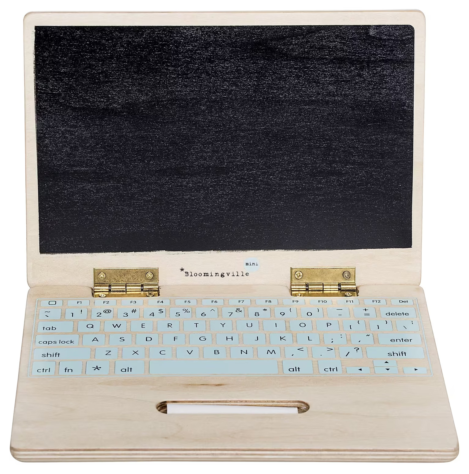 Datorn har fått en naturlig färgton med en snygg kontrast av svart, vilket ger en tidlös och stilren känsla. Materialet som använts verkar vara trä, vilket ger produkten en robust och långvarig kvalitetskänsla. Skärmen, som består av en svart tavla, erbjuder barn möjlighet att notera eller rita med krita, vilket ger en kreativ dimension till leksaken. Detta uppmuntrar både lärande och lek, och öppnar upp för egna fantasifulla äventyr.