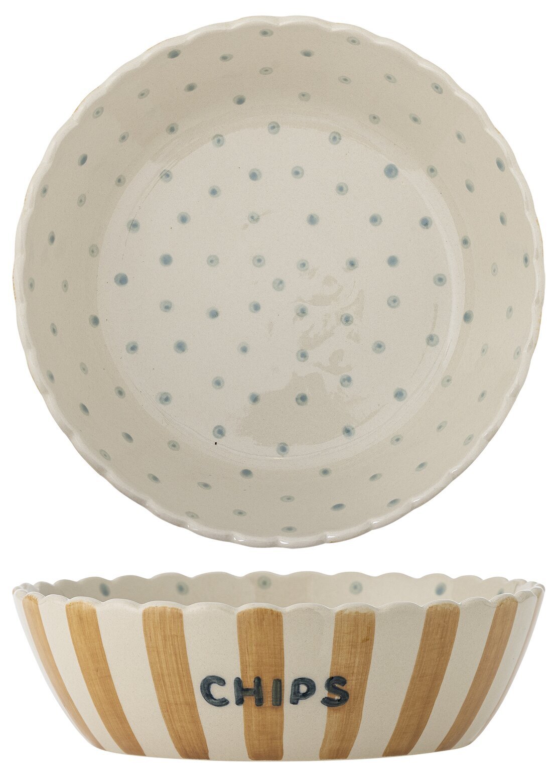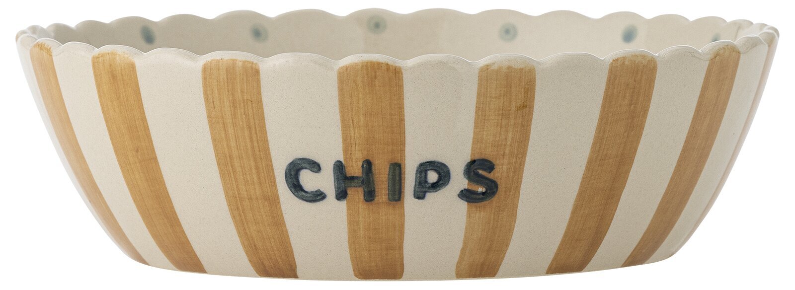 Chipsskålen från Bloomingville är en härlig serveringsskål i stengods som gör snacksstunden lite extra inbjudande. De handmålade ränderna i varma toner, den fina CHIPS-texten och de mjuka prickarna på insidan ger skålen ett lekfullt men stilrent uttryck, och den vågiga kanten blir en charmig detalj på bordet.