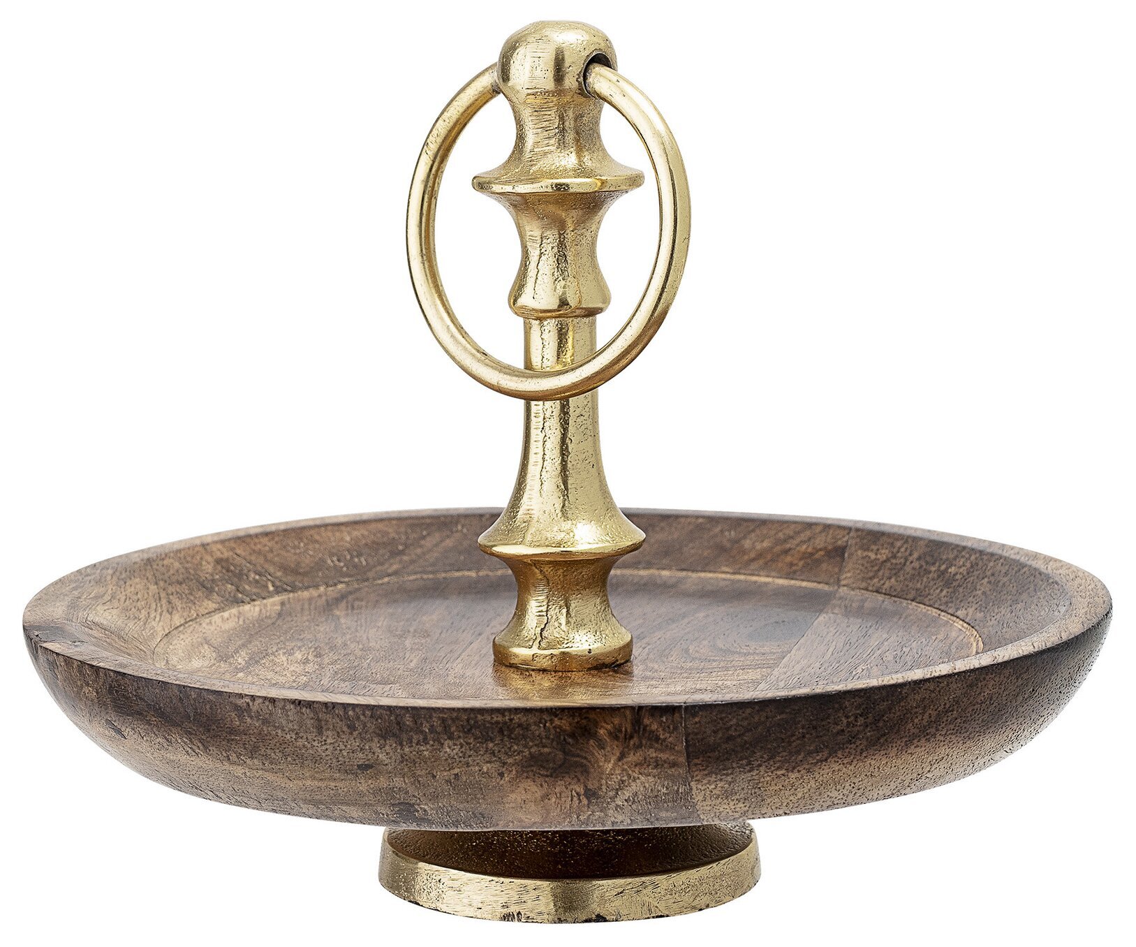 Kakfatet står stabilt på en liten fot, vilket lyfter upp det från underlaget och ger utrymme för skuggor och ljusspel som förhöjer estetiken vid olika ljussättningar. Den gyllene färgen på handtaget och fatets fot bidrar med en visuell kontrast mot det mörkare träet, vilket skapar en balans mellan robusthet och elegans.