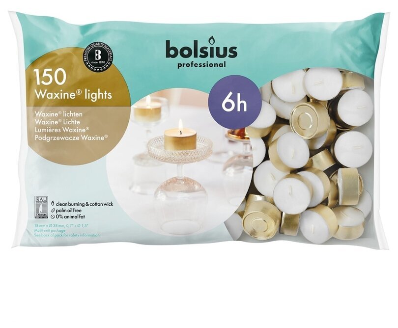 Centralt placerat på förpackningen står det med tydliga vita bokstäver att den innehåller 150 värmeljus, följt av ordet "Waxine lights" på flera språk. En cirkel på framsidan betonar dessutom att ljusen har en brinntid på 6 timmar, vilket är en attraktiv egenskap för många konsumenter.