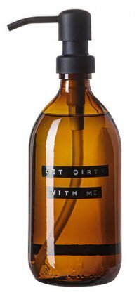 Den bärnstensfärgade flaskan fångar blicken med sin varma ton som både är tilltalande och praktisk, då den skyddar innehållet mot ljus. Ljuset reflekteras mjukt mot ytan och skapar en intressant spegeleffekt, vilket ger flaskan ett livligt och dynamiskt utseende. På flaskans framsida syns tydlig text i svart, där namnet Get Dirty With Me står tryckt i en minimalistisk men tydlig stil, vilket gör det enkelt att identifiera produkten.