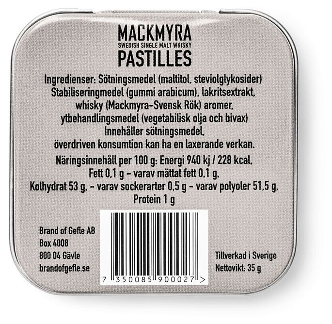 Pastiller med en lite rökigare ton samt tydliga inslag av enris & lakritsrot, välsmakande med äkta whiskey från Mackmyra. Denna plåtburk innehållande Svensk Rök är tillverkade i Sverige och smaksatta med naturliga ingredienser. Perfekt present till alla whiskeyälskare.