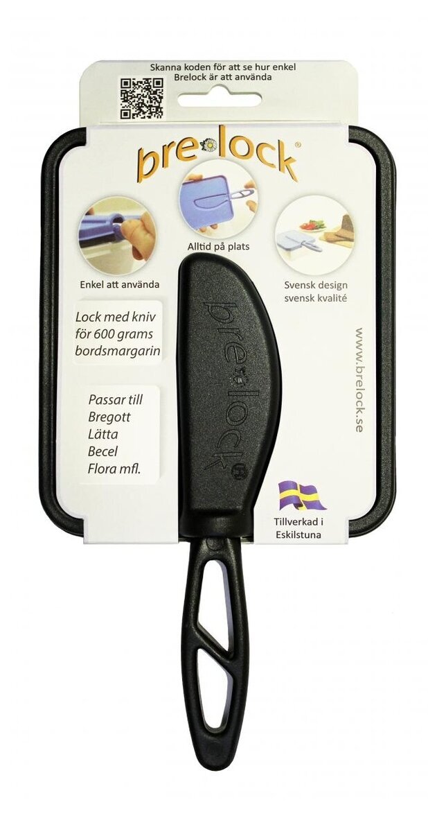Bilden föreställer en produkt från Köpstaden.se, närmare bestämt en artikel från varumärket Brelock. Produkten är ett smidigt lock med en inbyggd kniv, designat för att användas med bordsmargarin som väger 600 gram. Det svartfärgade locket framträder tydligt mot den vita bakgrunden, och i mitten av det syns varumärket Brelock diskret ingraverat. Knivens ergonomiska design betonas av det böjda handtaget, vilket är gjort av ett robust material som lovar hållbarhet och användarvänlighet.
